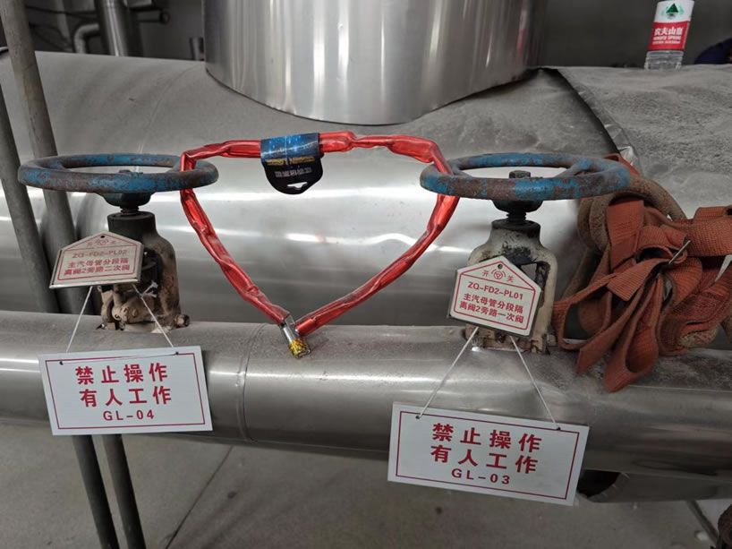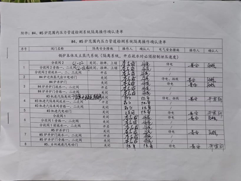 为确保作业安全,专业编制了#4、5炉范围内压力管道检测系统隔离操作确认清单,并对照安全措施逐项确认。开工前对各相关方开展入场培训、相关方管理制度学习以及现场安全技术交底;作业过程中严格执行各项管控措施,包括持票作业、持证上岗、劳动保护用品佩戴、高处作业安全、用电安全等;并抽调刘贇全天全过程监护和协调脚手架搭拆、保温施工、管道打磨及压力管道检测工作。